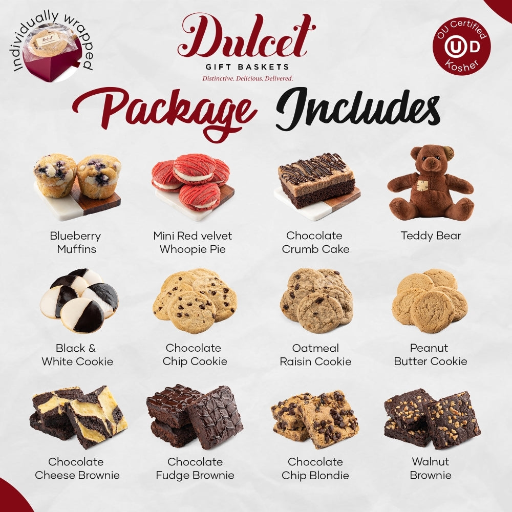When someone you care about needs a lift, nothing says "get well soon" quite like treats that taste as good as they feel. Our Deluxe Gift Tin arrives packed with gourmet baked goodies crafted right in our own bakery using premium ingredients—because recovery deserves something special. Snuggle up with the adorable teddy bear companion included in every tin, a cuddly reminder that you're thinking of them. Kosher-friendly and bursting with flavor, this gift basket transforms tough days into moments of comfort and joy. The perfect pick-me-up for hospital stays, surgery recovery, or any time someone needs a little extra TLC.