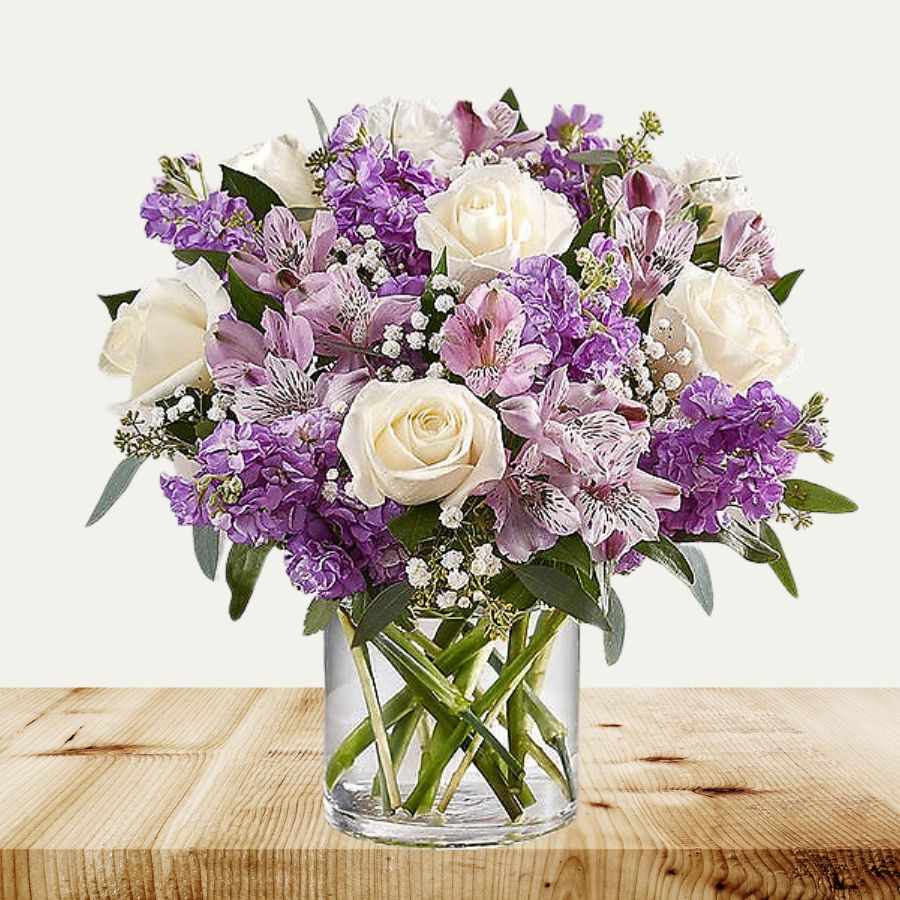 Los recuerdos más bonitos se crean con regalos pensados ​​para las personas que nos importan. Nuestro encantador ramo de flores de lavanda está confeccionado con una combinación de flores blancas y lavanda. Diseñado a mano dentro de un jarrón cilíndrico transparente con follaje en cascada por todas partes, es una manera maravillosa de expresar los sentimientos que tienes en tu corazón.