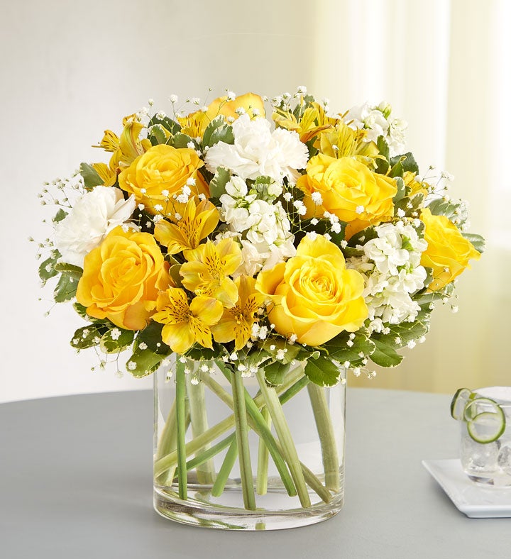 Lleno de alegría y alegría, nuestro ramo de colores brillantes es la sorpresa perfecta para hacerles sonreír. Flores amarillas y blancas se unen con follaje exuberante en un jarrón cilíndrico transparente. Perfecto para expresar un cálido sentimiento a alguien que significa tanto para ti.