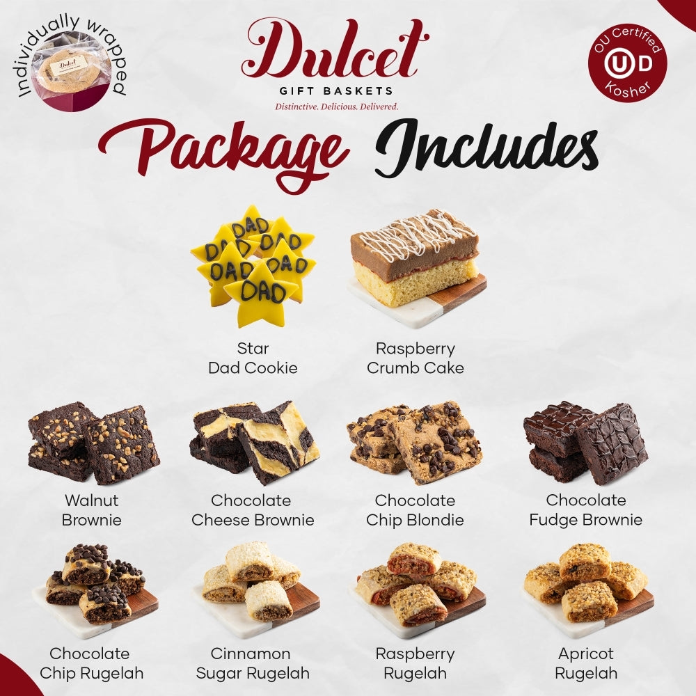 1 DAD STAR COOKIES TOP OFF UNIQUE COLLECTION: This classy package showcases a collection of rugelach, brownies, and a crumb cake that is bursting with rich flavor. It also features beautiful, hand-designed star-shaped cookies that scream” #1 Dad” from their cheerful yellow icing. It’s like sending dad a loud round-of-applause!