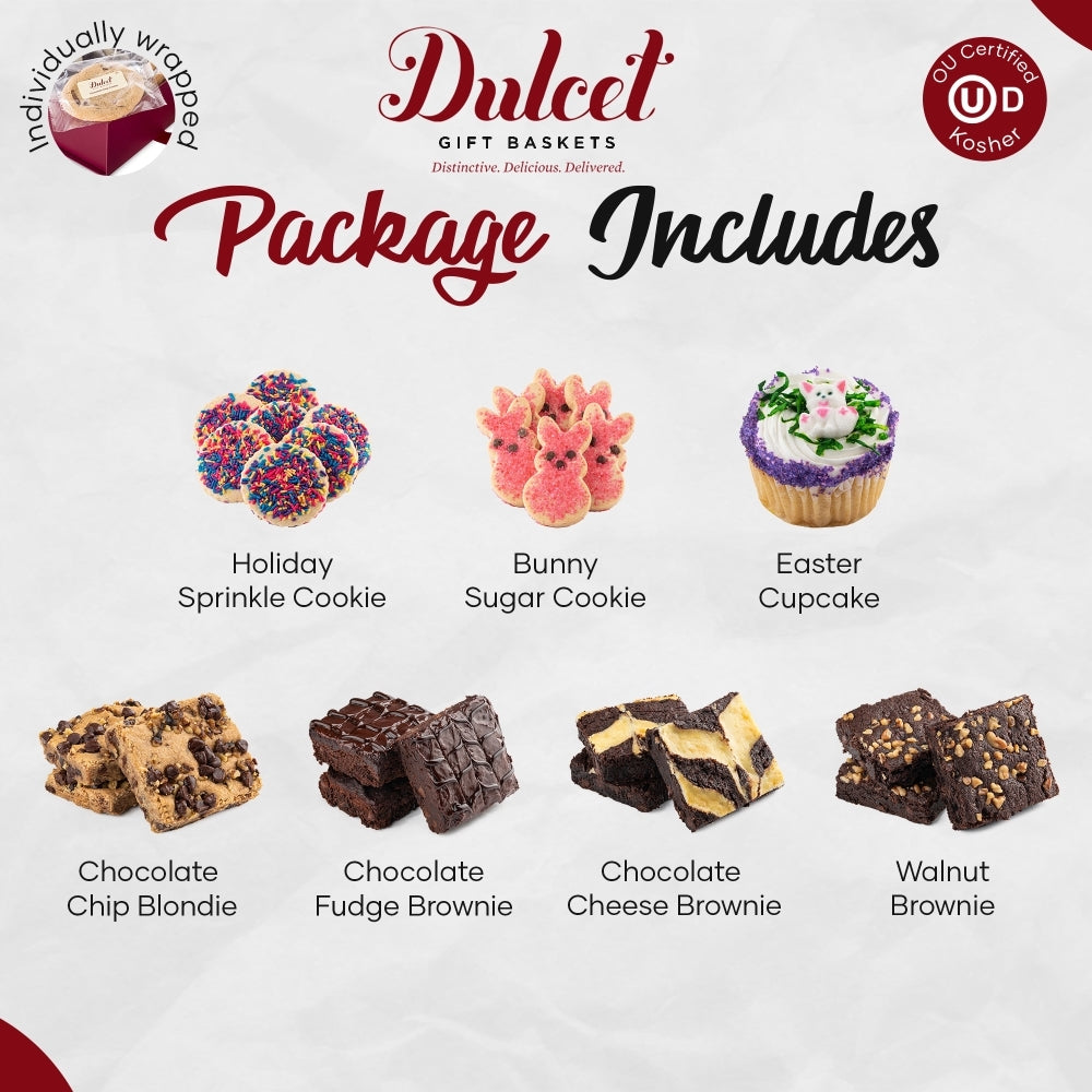 Included in the signature cardboard box are fresh soft vanilla cookies, an Easter cupcake decorated with royal icing, and ultra-chewy brownies among other fresh goods.