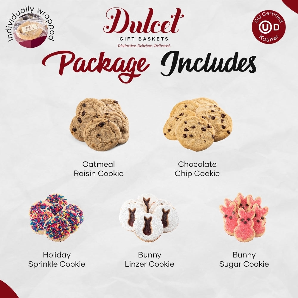 Our Easter gift box is designed to be the highlight of any gathering. Filled with a sumptuous selection of delectable treats, this cookie gift basket is the ultimate Easter delight. Whether for a family gathering or a festive celebration, our cheerful Easter surprise will bring joy and excitement to everyone. Packaged in a brown paper box adorned with a Dulcet-stamped sticker, it’s ready to impress. Thrill the entire family with this delightful assortment of mouthwatering cookies. Each treat is individually appealing and oh-so yummy! Perfect as a gift for mom and dad, friends, or anyone who loves delicious baked goods. This petite cookie reward is a fabulous gift idea that is sure to be appreciated. Pack of 12