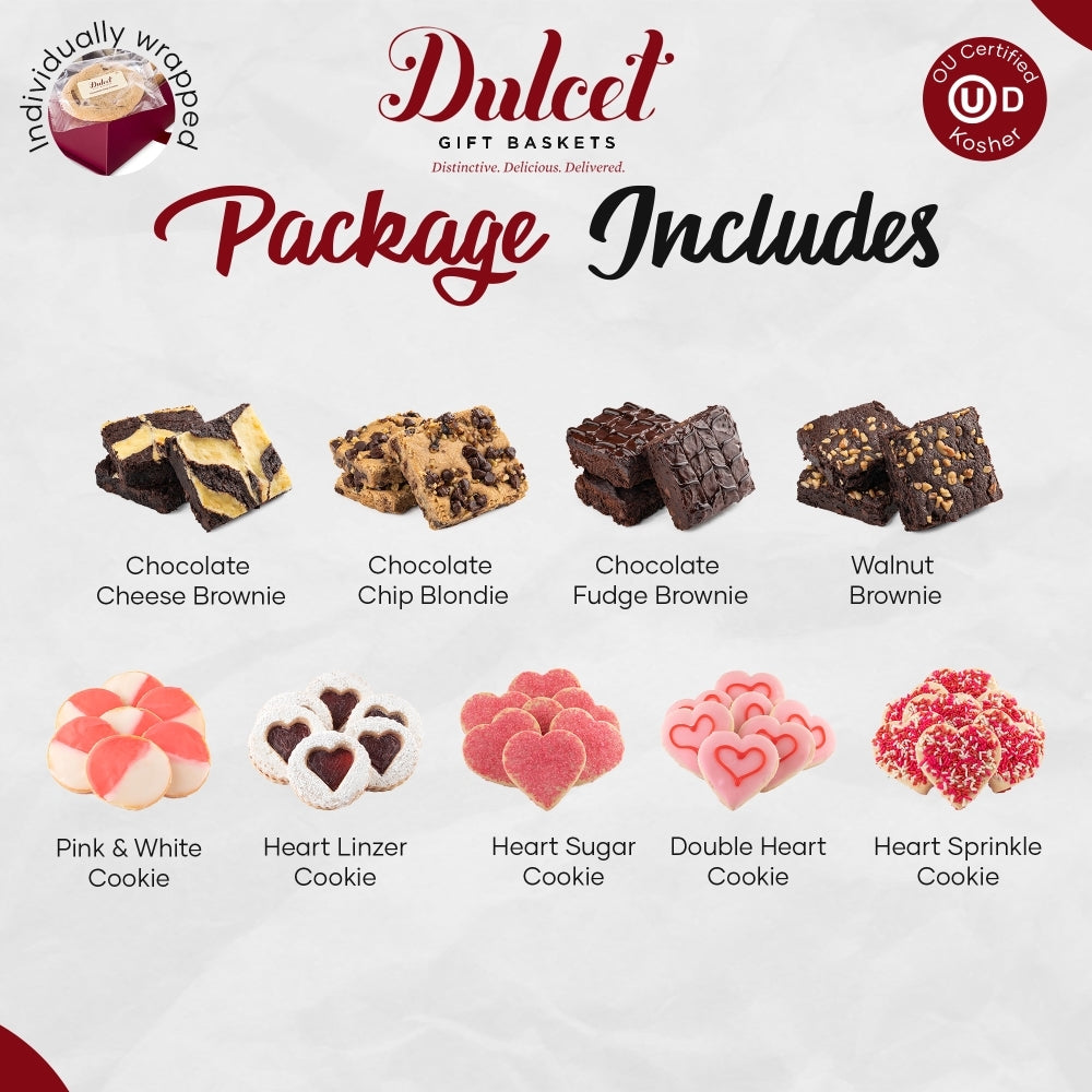 Your Valentine will be duly surprised as this basket reveals an assortment of flaky fruit-filled rugalach, feminine pink and whites, and vanilla cookies sprinkled in red.