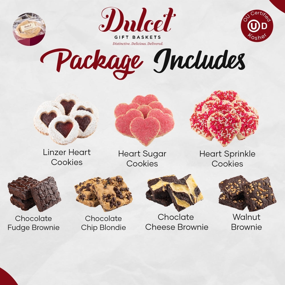 Here’s what we came up with. A cool Kraft box, filled to the brim with pink iced heart-shaped cookies, classic Linzer tart cookies with a heart-shaped center, and succulent brownies.