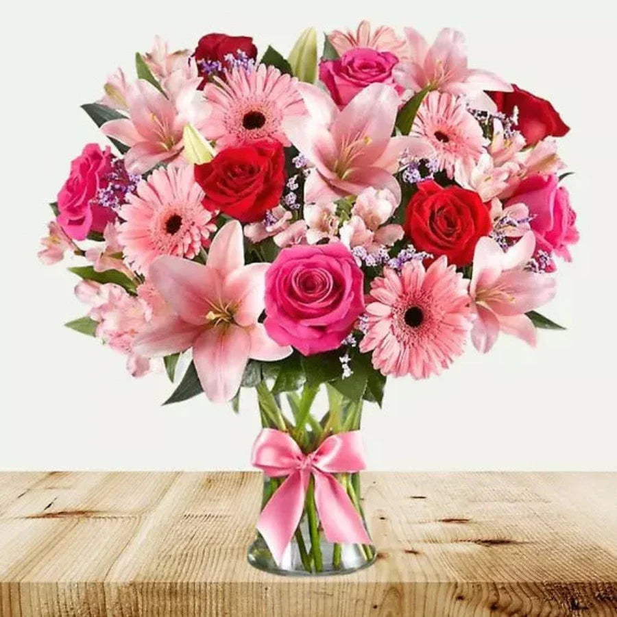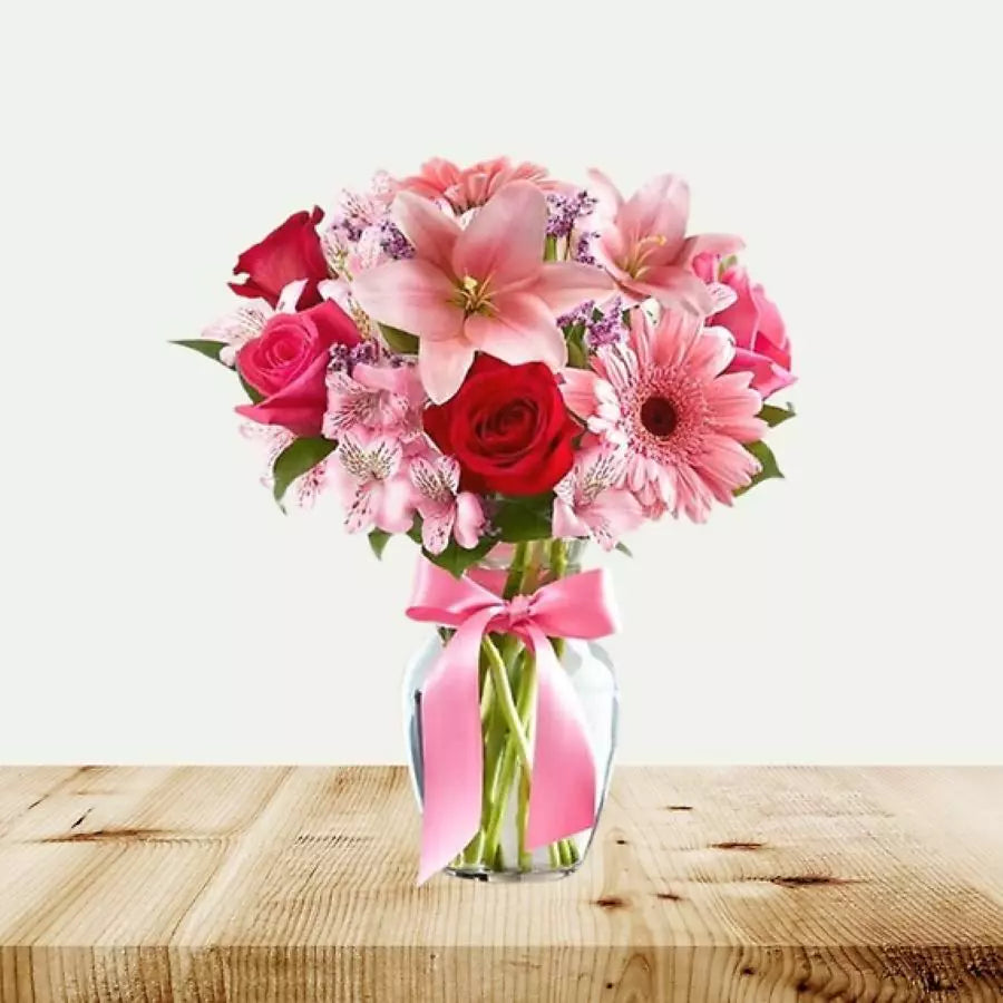 Inspired by the rich beauty of the European countryside, our romantic bouquet reveals all the feelings you have in your heart. Fresh-picked pink & red blooms are on display inside a glass vase finished with ribbon, creating a timeless gift for someone you love.