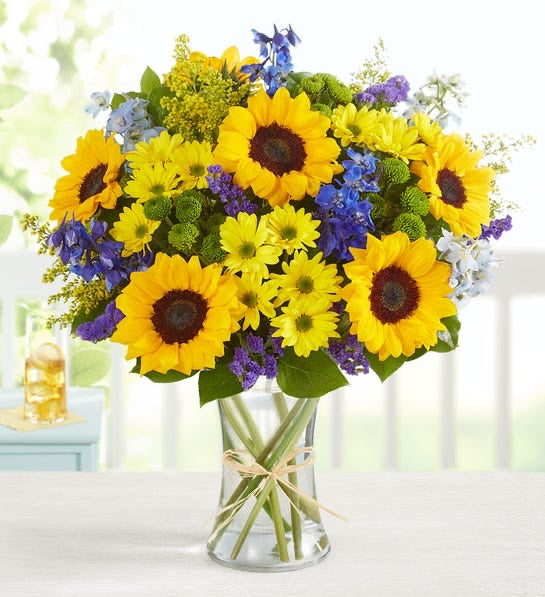 Drawing inspiration from the vibrant hues of the European countryside, this popular summer bouquet features freshly picked flowers that showcase nature’s rustic elegance. Bright golden yellows and deep blues stand out beautifully against verdant greenery, making it a classic and heartfelt gift for someone you cherish.