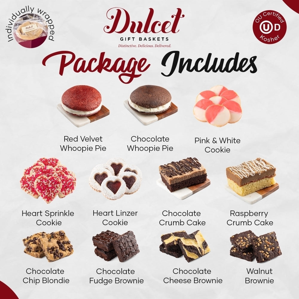 In addition to our classic whoopie pies, you will find jellied Linzer tarts dusted in white sugar and crunch-topped brownies, securely packaged in our signature cardboard box.