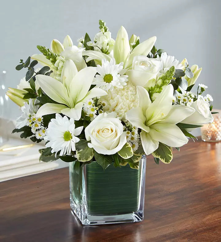 There is an innocence to all souls that is evoked in an expression of pure white. Our sympathy arrangement of angelic white roses, lilies, mums, daisy poms and more, expertly arranged in a clear glass cube lined with a Ti leaf ribbon, makes for an exquisite gesture of comfort and healing.