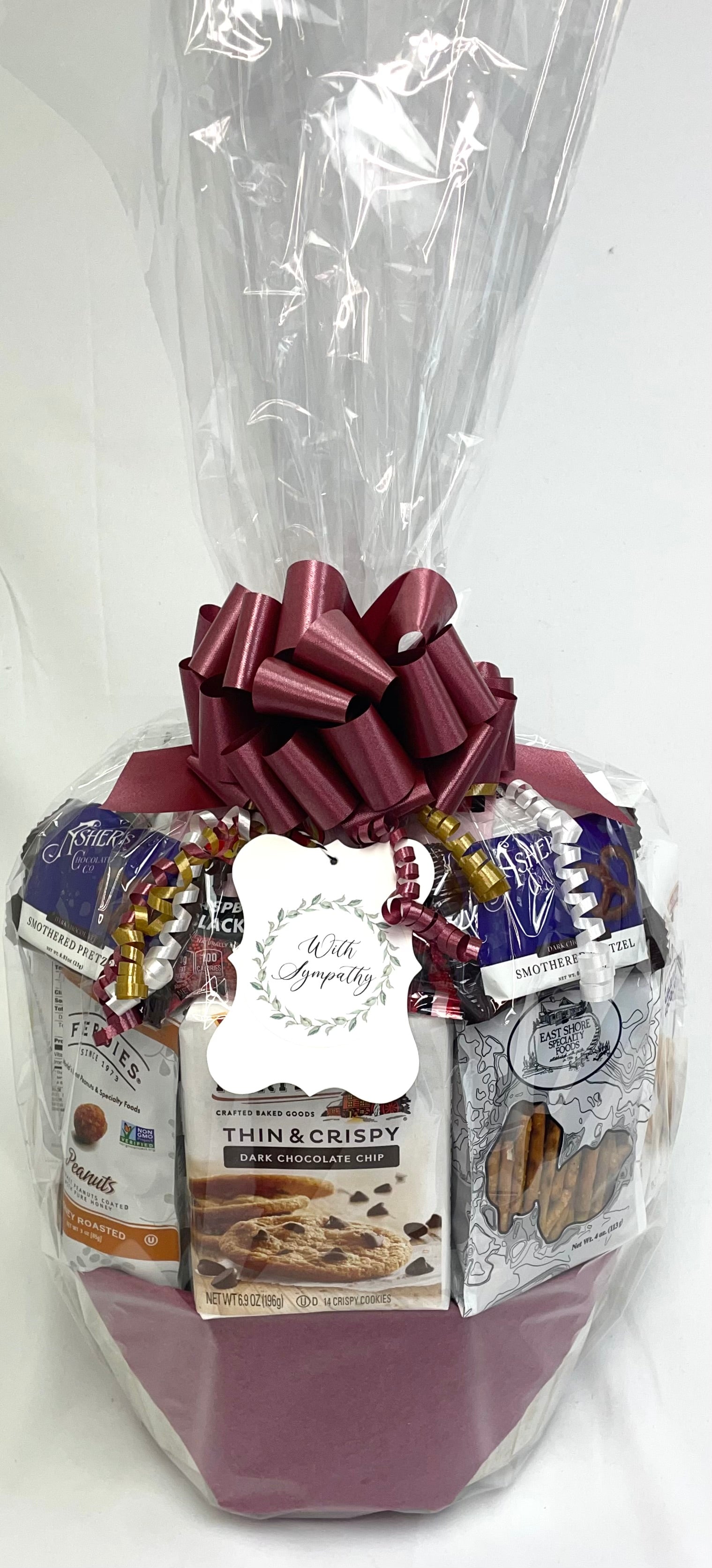 Each basket comes with a heartfelt sympathy tag and includes a delightful assortment of gourmet treats: two boxes of Pepperidge Farm Crackers, a selection of Large Pepperidge Farmhouse Cookies, Goldfish, Milano, Chessman, or Veronas, and two Chocolate Covered Pretzels.