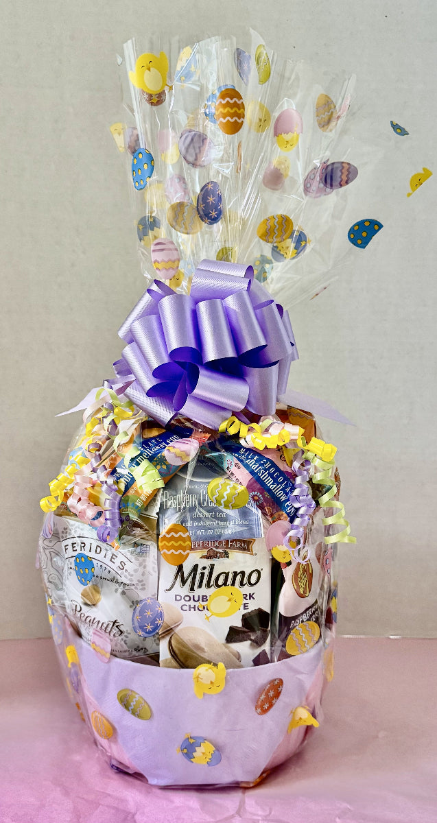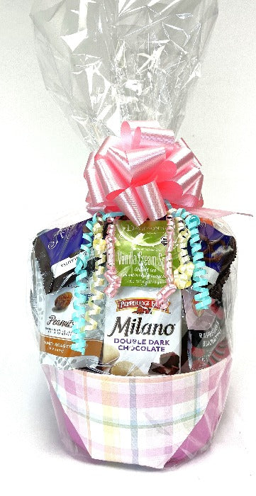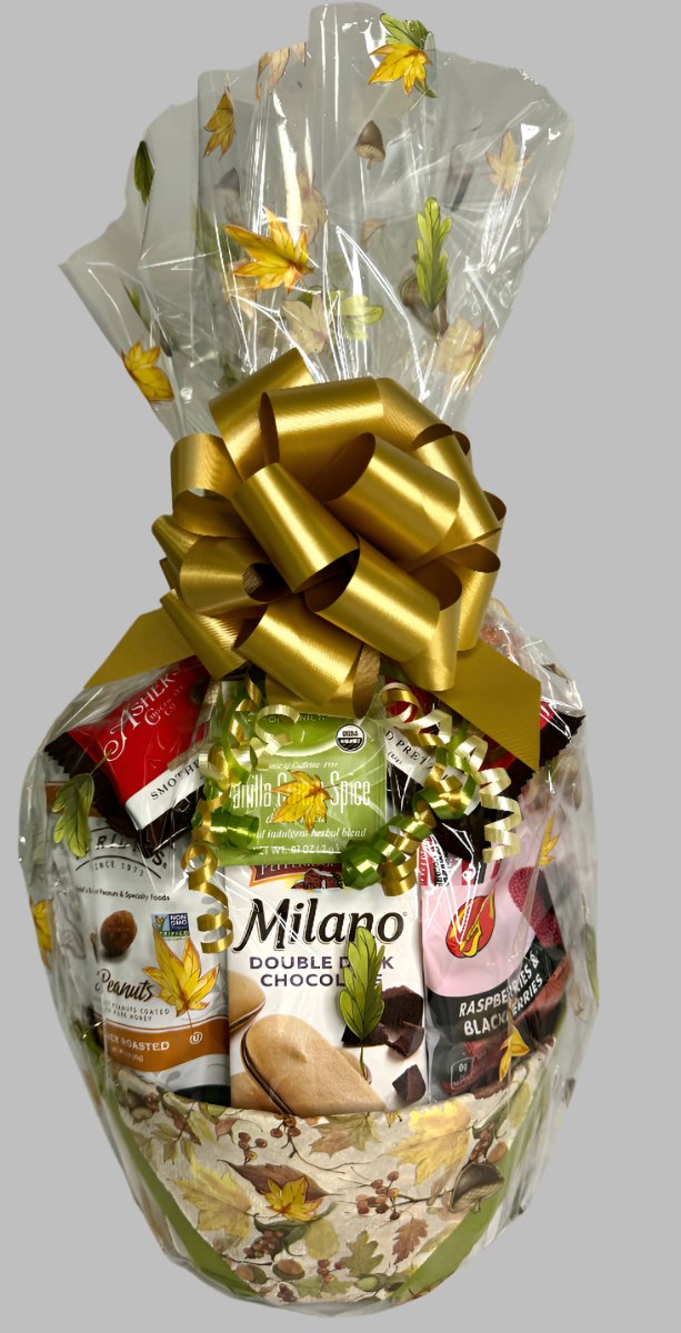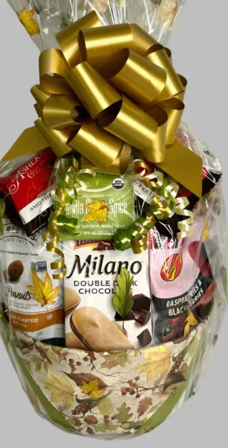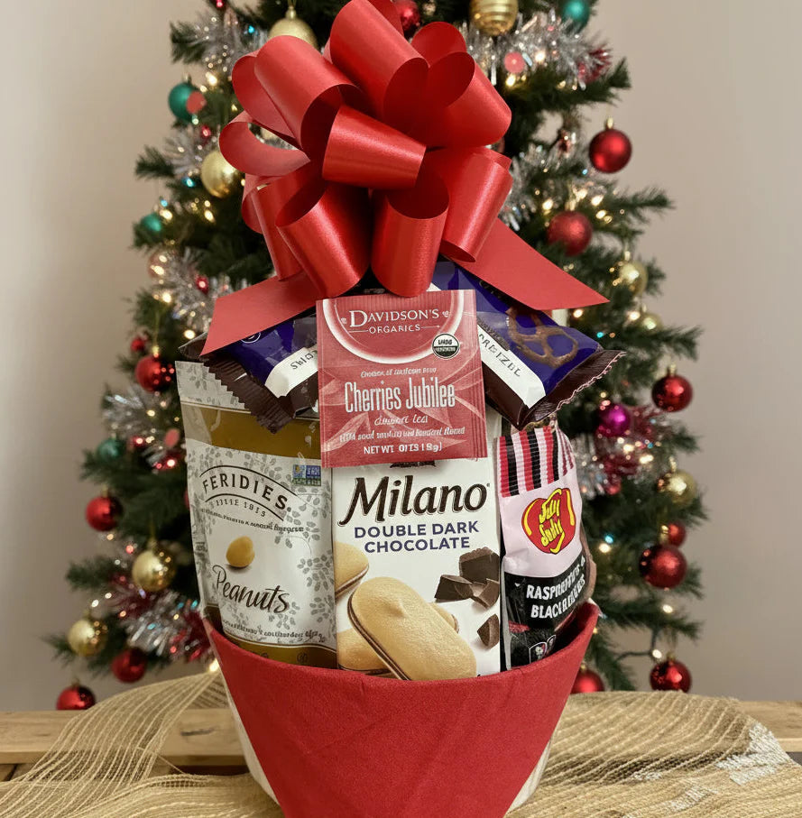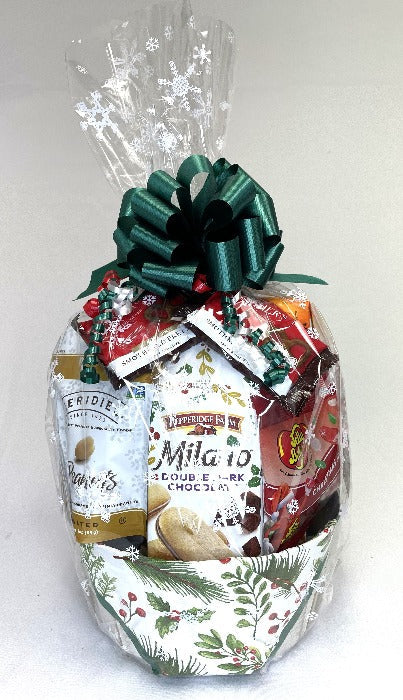 Priced at just $59, the Classic Gift Basket includes: 1 Box of Pepperidge Farm Crackers, Milano, Goldfish, Chessman, and 2 Chocolate Smothered Pretzels. You'll also find Jelly Belly Jelly Bean Packets, Raspberry and Blackberry Jellied Candies, Seasoned Pretzels, Feridies Peanuts, 2 Chocolate Covered Graham Crackers, and 1 Tea Packet.