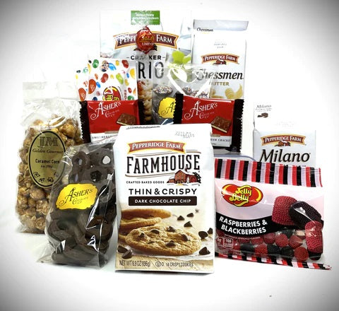 Sweet - Indulge in Pepperidge Farm Crackers, Milano Cookies, Chessman Cookies, Farmhouse Cookies, Caramel Popcorn, Chocolate Covered Pretzels, 2 Jelly Beans Packets, 2 Chocolate Covered Graham Crackers, Jelly Belly Raspberry & Blackberry Jellied Candies, and a Lindor chocolate!