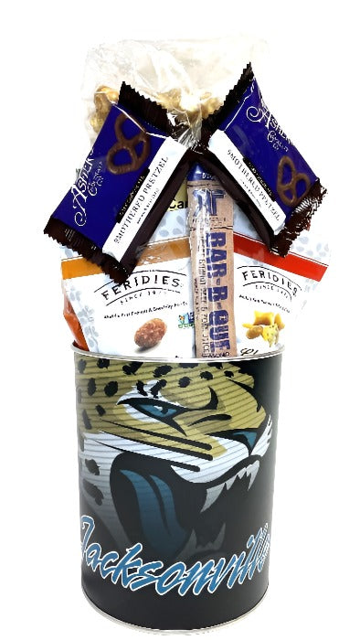 Unleash your team pride with the exclusive Jacksonville Jaguars Gift Basket! This sleek gift tin, brimming with a gallon of taste-tested snacks, is the ultimate way to celebrate with friends and family—DUUVALL!