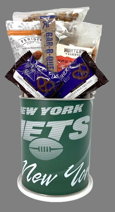 Celebrate your Jets spirit with this vibrant gift tin basket, brimming with team pride and sure to delight even the most passionate fans. It's the ultimate gift for any Jets enthusiast, packed with snacks and treats to gear up for the big game. J E T S Jets Jets Jets!