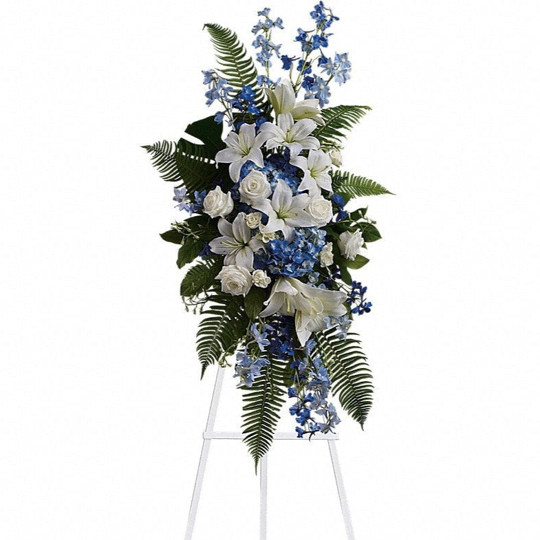 Tranquil blue and white flowers reminiscent of a soft ocean breeze offer comfort. The standing spray presented on an easel includes fragrant white lilies and tropical greenery.