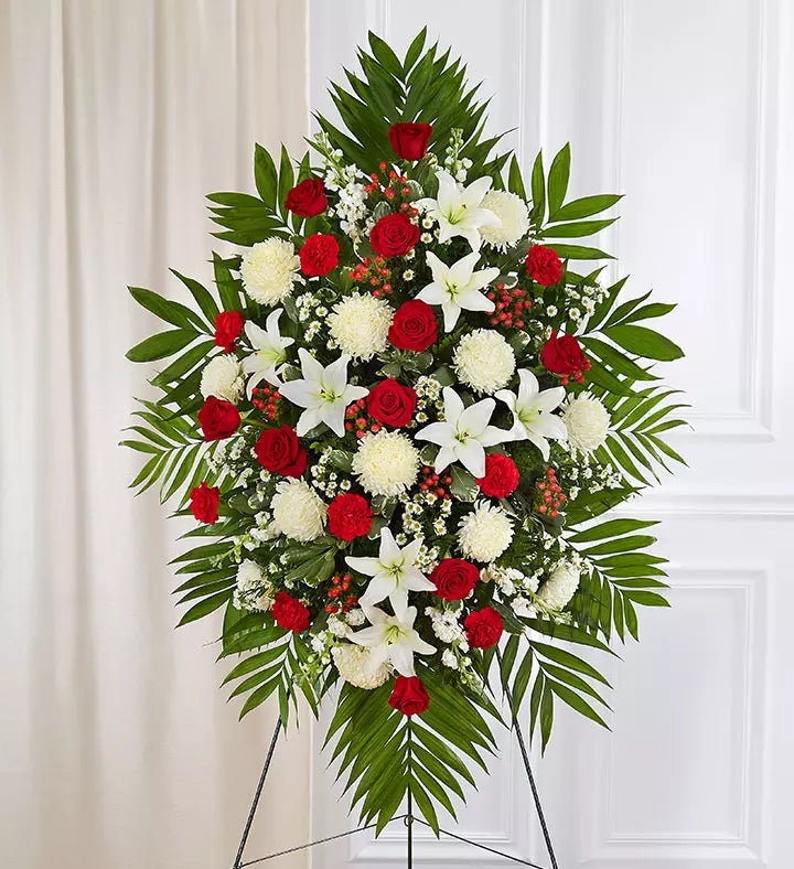 A warm embrace. A kind word. A memorable gesture. There are many ways to express how we feel after the loss of a loved one. Our classic standing spray arrangement is elegantly crafted with radiant red roses and peaceful white blooms, offering care and support when it’s needed most.