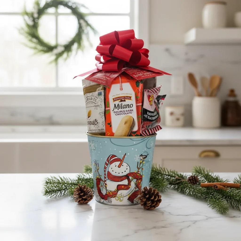 Learn About the Small Whimsical Snowman Gift Tin Basket - Holiday Gift