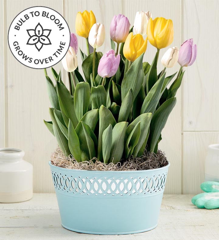 Welcome the new season with a burst of color from our tulip bulbs. These rooted, sprouted bulbs will showcase beautiful pink, purple, and yellow blooms. Arranged in a bright blue container, this gift embodies the joy and cheer of spring.